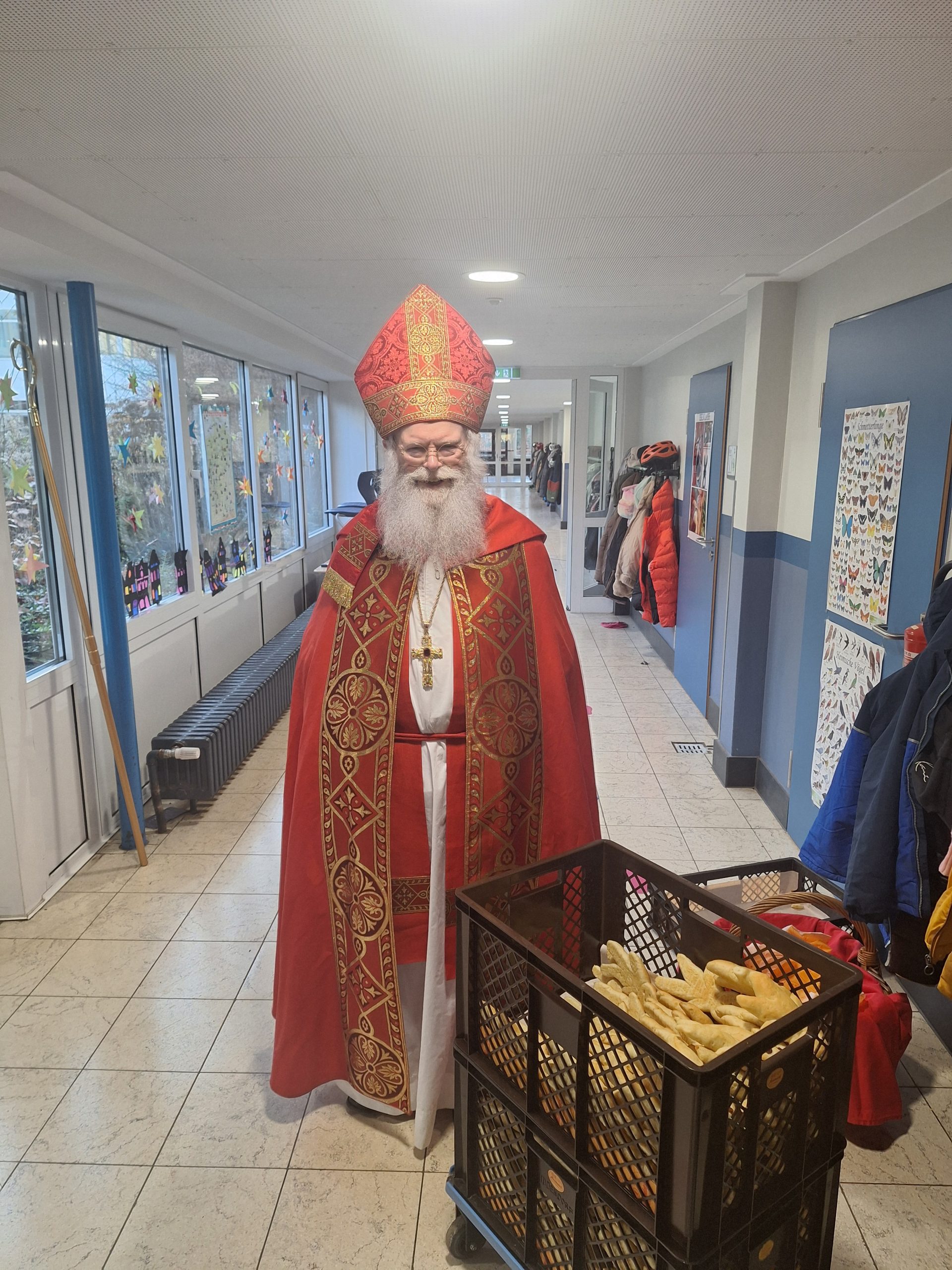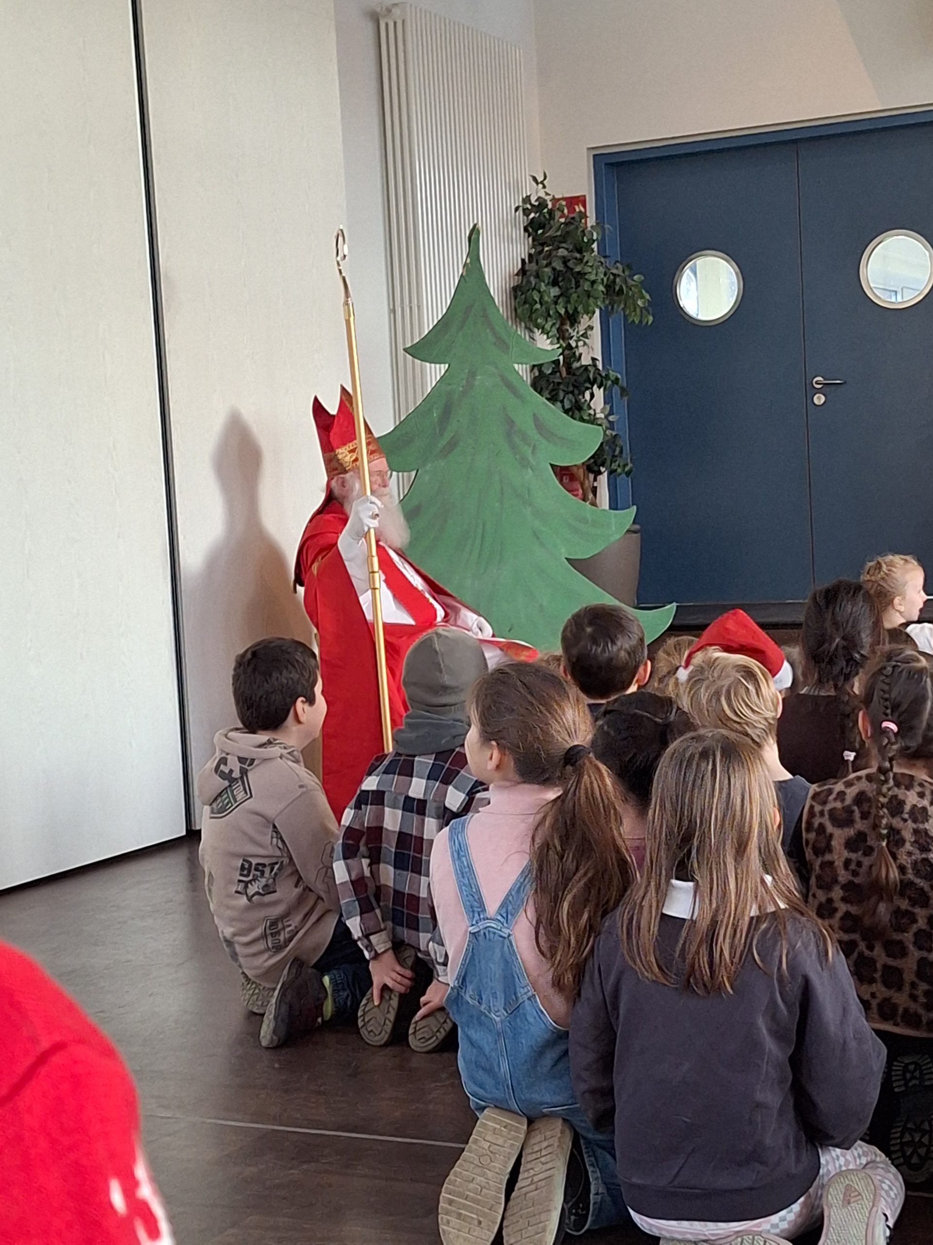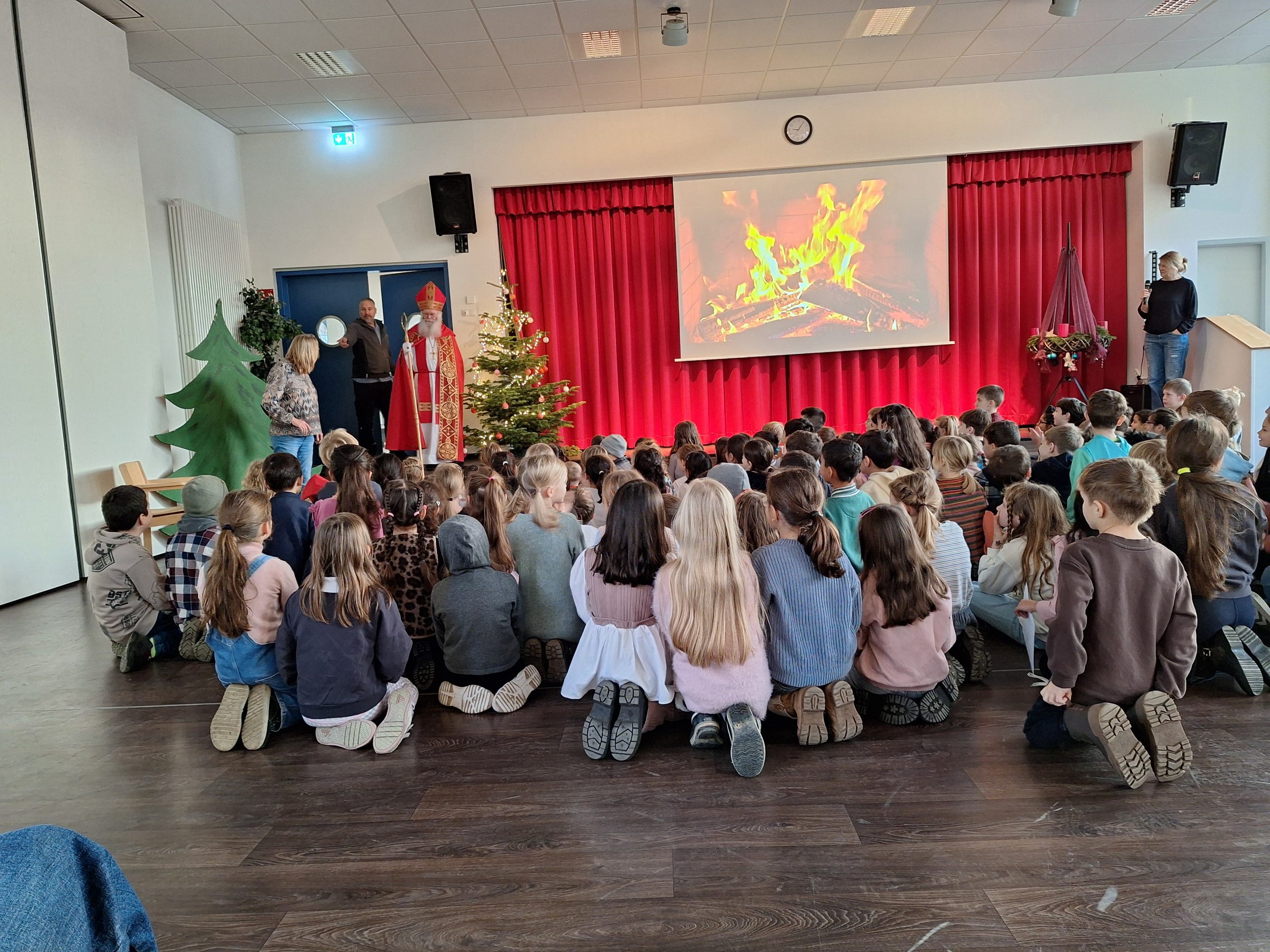 Nach einem ereignisreichen Wochenende machte der Nikolaus am Montag, dem 08.12.2025, seinen letzten Stopp an der Wallschule. Voller Vorfreude versammelten sich die ersten und zweiten Klassen in der Aula, um den besonderen Gast zu begrüßen. Nachdem der Nikolaus ein paar herzliche Worte an die Kinder gerichtet hatte, präsentierten die Klassen ein abwechslungsreiches und liebevoll vorbereitetes Programm: Die Eulenklasse trug selbst verfasste Elfchen vor, die ersten Klassen sowie die Fuchs- und Elefantenklasse sangen Lieder mit Gebärdensprache, und die Kolibriklasse begeisterte mit einer Darbietung der „Weihnachtsmaus“. Die Beiträge sorgten für strahlende Gesichter und machten die Kinder sichtbar stolz auf ihr Können. Zum Abschluss hatte der Nikolaus natürlich auch eine kleine Überraschung im Gepäck: Jedes Kind erhielt einen frisch gebackenen Stutenkerl – und dieser wurde anschließend in den Klassen mit großem Genuss verputzt. Ein rundum gelungener Besuch, der allen noch lange in Erinnerung bleiben wird!