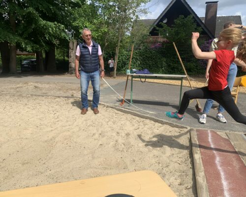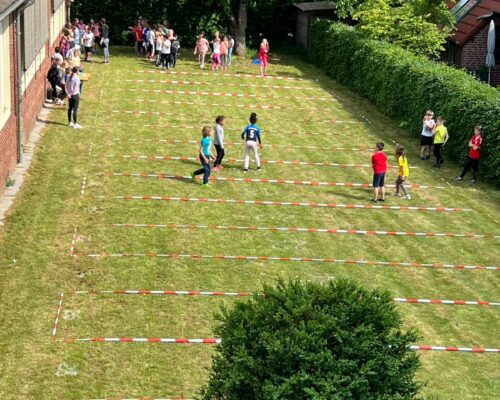 Die diesjährigen Bundesjugendspiele der Jahrgänge 2-4 fanden aus organisatorischen Gründen auf dem Schulhof und nicht im Stadion statt. Dies hat aber der Freunde, Motivation und dem Ablauf dieses Tages keinen Abbruch getan. Ganz im Gegenteil – sowohl die Lehrer als auch die Kinder waren sehr zufrieden mit diesem Tag und man sah viele strahlende Gesichter. Es wurden die Disziplinen Schlagball, Weitsprung und der 50 m Lauf abgenommen. Zusätzlich wurde der Drehwurf sowie Seilspringen von den Schülerinnen und Schülern absolviert. Um die Wartezeit an den Stationen zu verkürzen, wurde im Innenhof eine Chill- Out- Zone sowie auf dem Schulhof eine Tanzstation eingerichtet. Und am Ende gab es für alle ein wohlverdientes Eis.